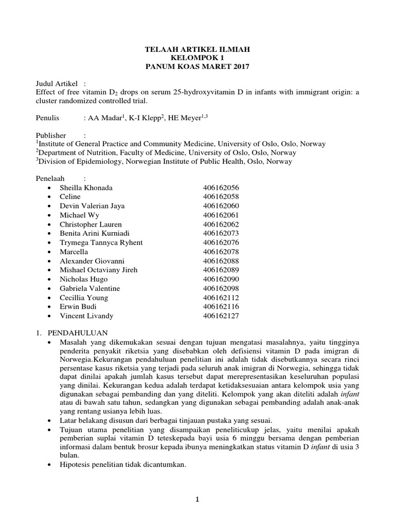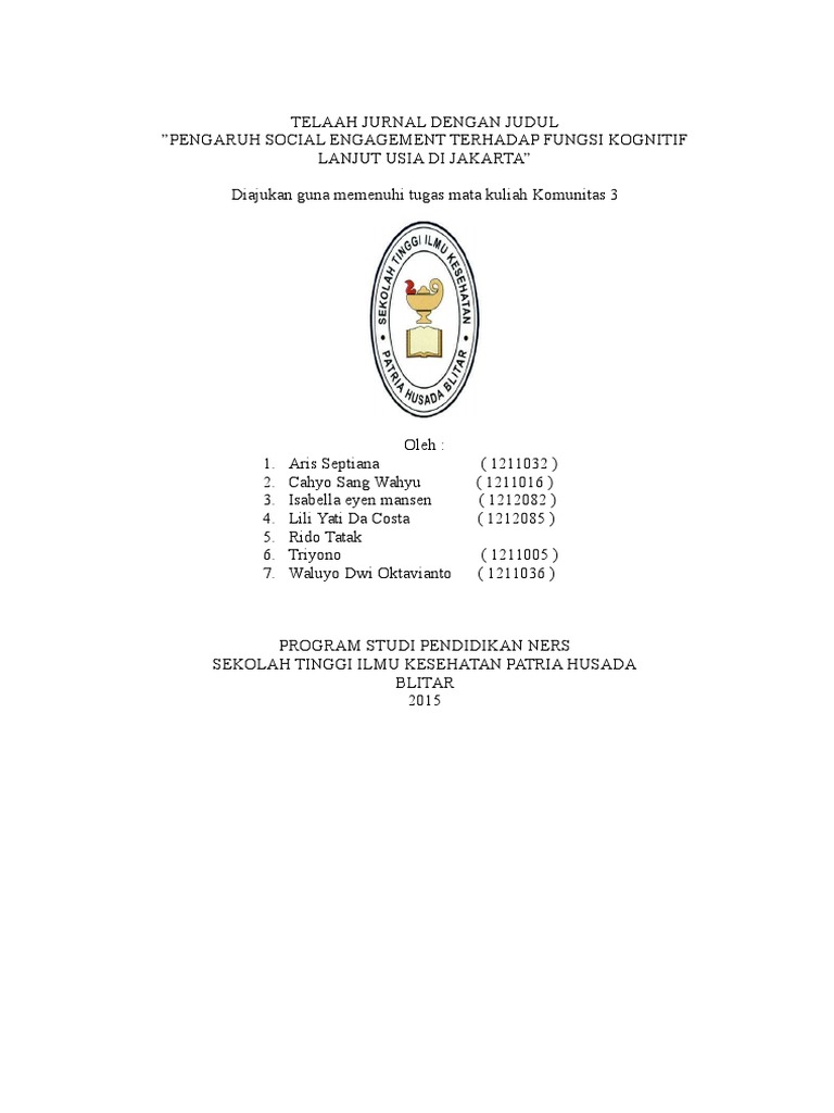 Judul sudah menggambarkan topik utama penelitian, tidak terlalu panjang dan pendek, cukup jelas, akurat, dan menarik minat untuk membaca isi jurnal. Telaah jurnal penelitian pengaruh pemberian cincau terhadap tekanan darah pada lanjut usia yang menderita hipertensi di posyandu lansia desa trimulyo jetis bantul untuk memenuhi tugas telaah jurnal study profesi departemen gerontik disusun oleh : Div kebidanan / d telaah jurnal pengaruh karakteristik ibu hamil dan pengetahuan terhadap sikap ibu tentang kehamilan risiko tinggi di wilayah kerja puskesmas tanjung beringin tahun 2012 1. 60% (5) 60% menganggap dokumen ini bermanfaat (5 suara) 7k tayangan 19 halaman. Format telaah jurnal uraian pico ( problem, intervention, comparison, outcome) problem: