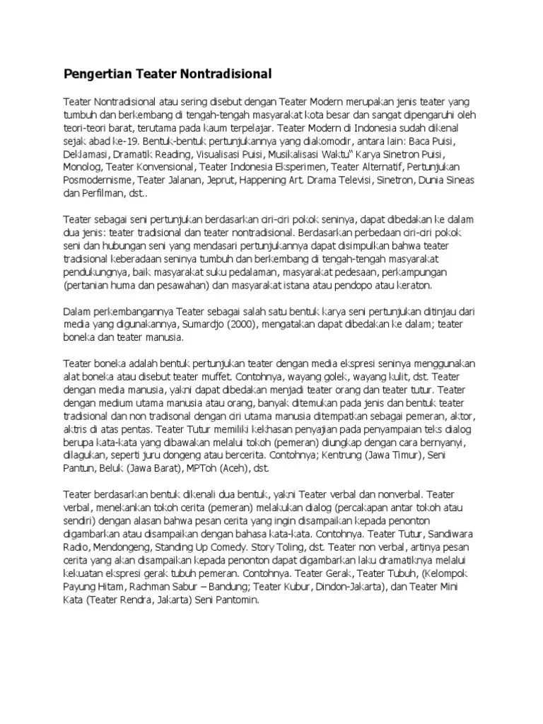 Peta kompetensi kompetensi mengidentifikasi perbedaan teater tradisional, modern dan kontemporer menunjukkan identifikasi dari fungsi teater tradisi, . Sebenarnya, teater tradisional dan teater modern tidak memiliki perbedaan jauh. Pada naskah dan sumber ilmunya dari dunia barat, . Teater nontradisional atau sering disebut dengan teater modern merupakan jenis. Dengan demikian, dalam rumusan sederhana teater adalah pertunjukan.